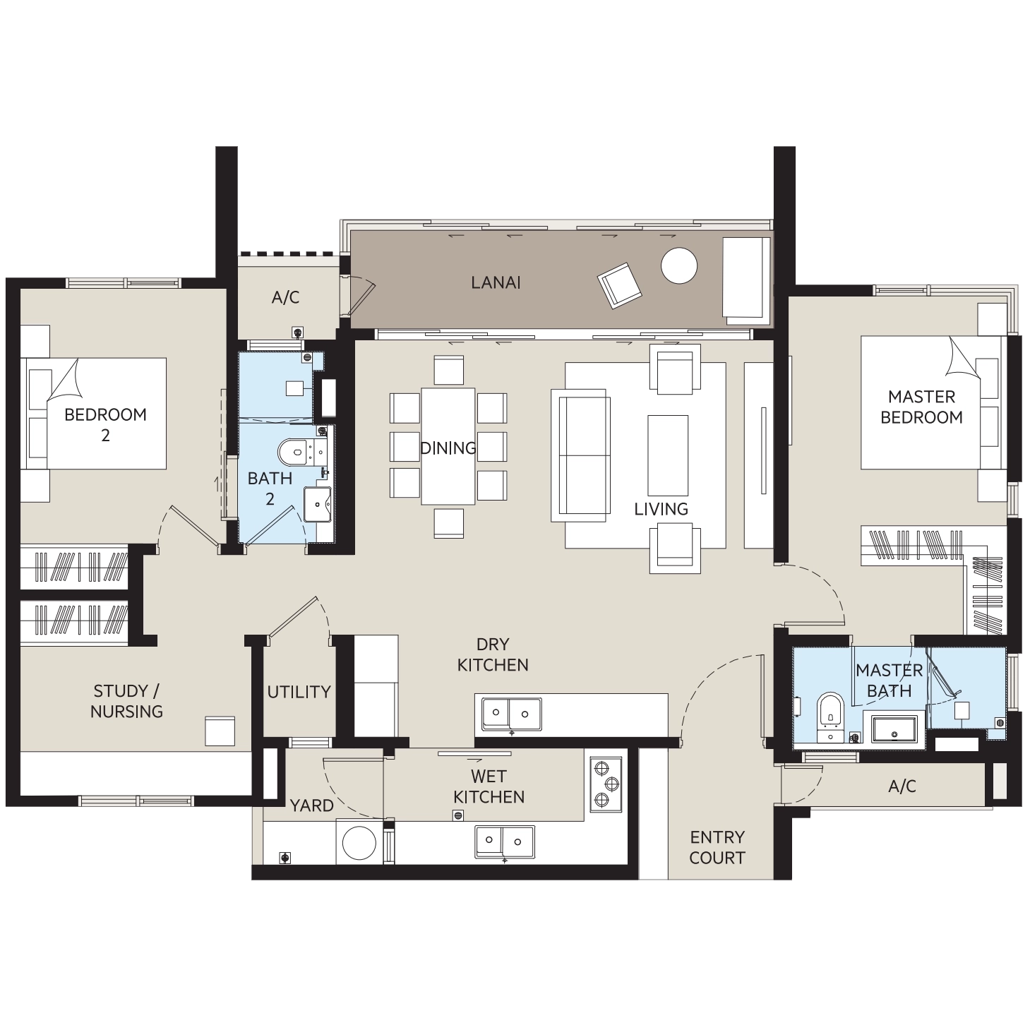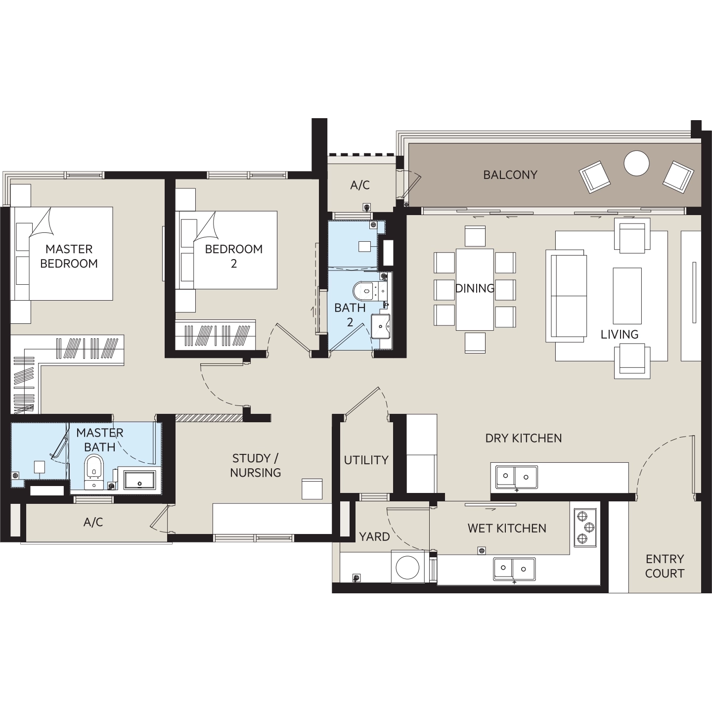 2 Bedroom + 1 Studyroom & 2 Bathroom